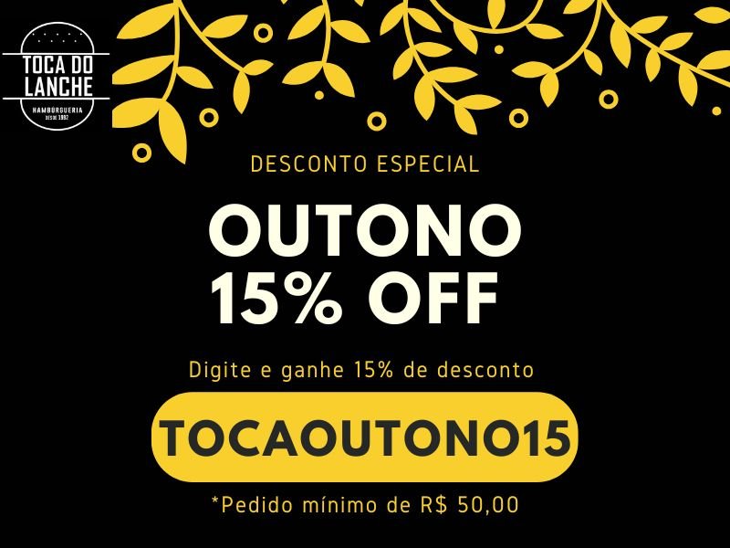 RESGATE O SEU CUPOM E GANHE 15% OFF AO FINALIZAR O SEU PEDIDO Fazendo um pedido na Toca do Lanche